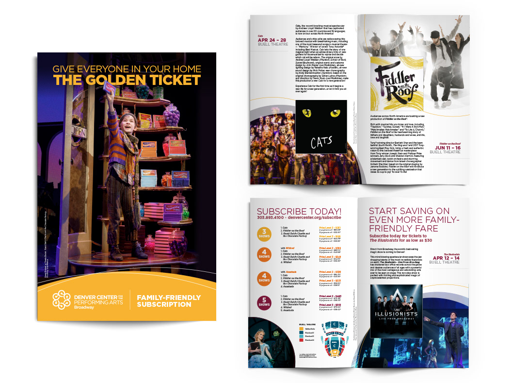 Production work for a 12-page brochure/mailer to promote Denver Center for the Performing Art’s family package for Broadway shows.