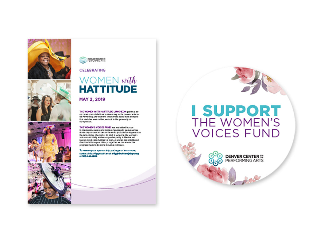 We created event collateral and a sticker for Denver Center for Performing Arts Women with Hattitude Luncheon event. The event raises money for The Women’s voices fund.